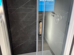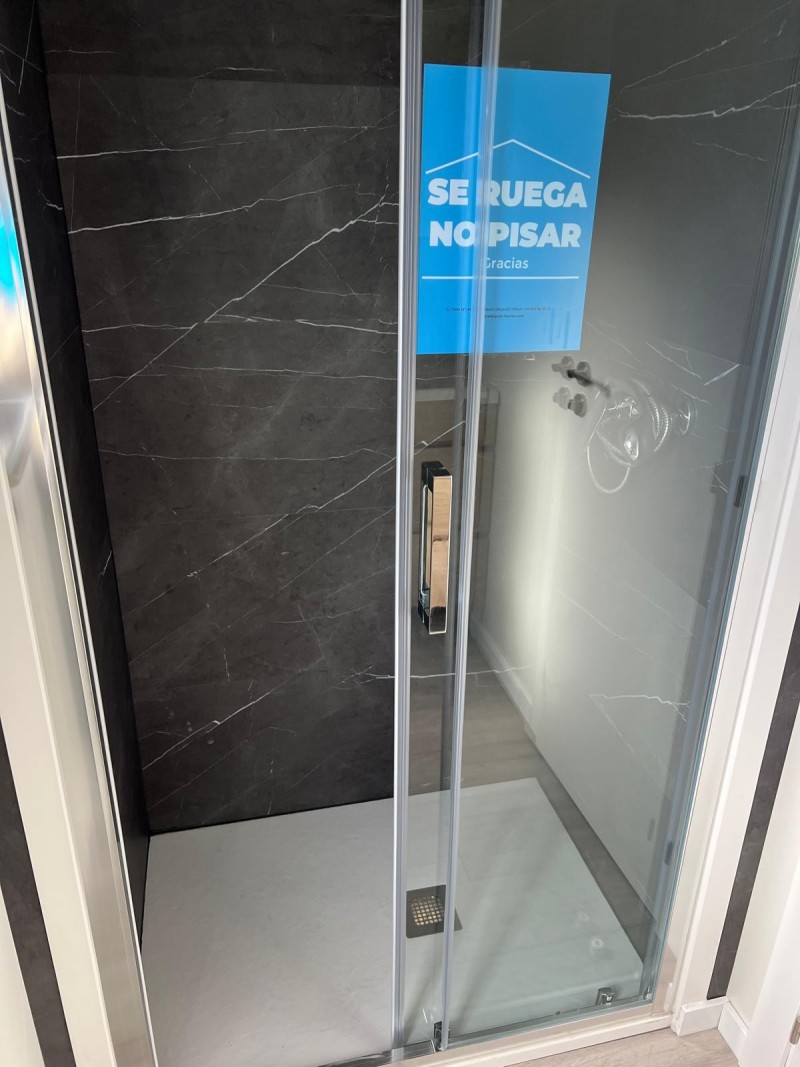 • Baño completo con plato de ducha con mampara vidrio transparente.