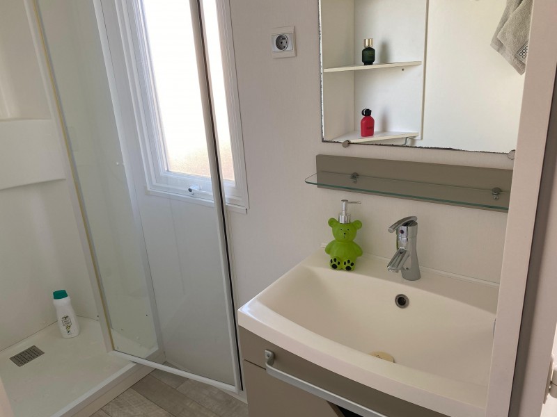 • Baño con cabina de ducha y lavabo.